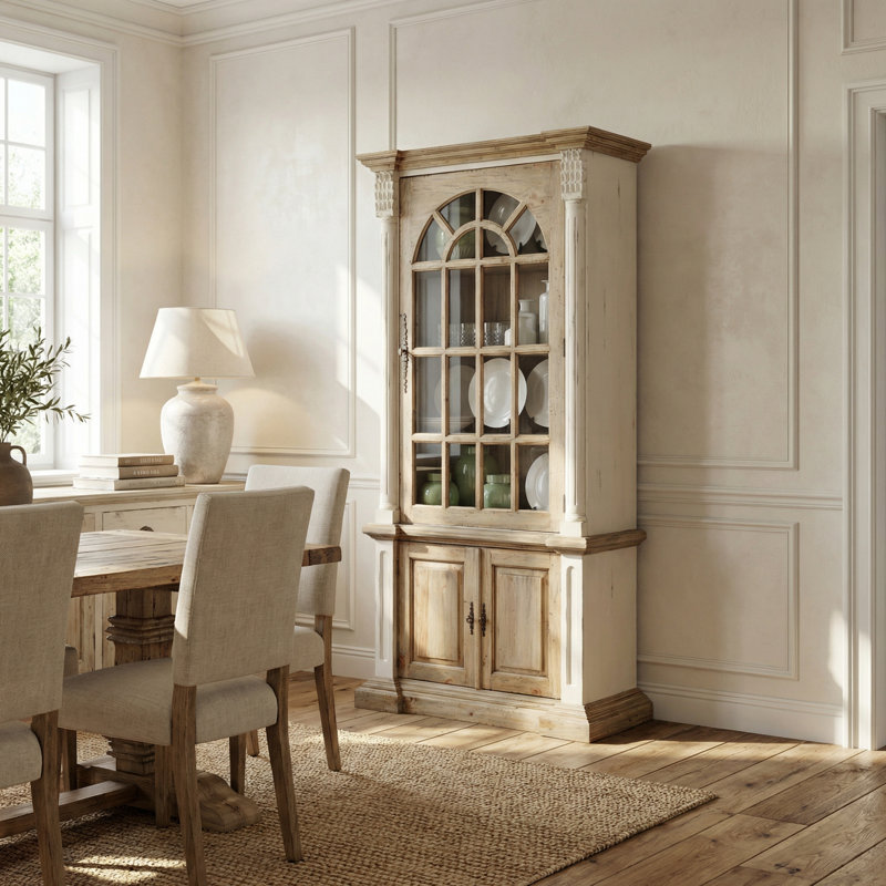 It features a classic arched glass-paneled door opening to shelving, with additional cabinet shelf storage behind closed doors in the base. The cabinet hutch is handmade, actually real bench-made furniture one piece at a time. It is crafted using 100 percent authentic Reclaimed Pinewood imported from New Zealand. Reclaimed wood is old repurposed wood rescued from old barns, houses, barns, boxcars, and wine barrels. Wood is highly prized for the authentic seasoned effects and age-old character. The finish is a combination of natural wood with a beautifully balanced contrast of Chalk Antiqued White paint. The hutch is a part of a growing American Farmhouse and Coastal Series from the Heritage Collection, a division of AFD Home. The Series offers many affordable yet appropriately fashioned designs of furniture for a more relaxed lifestyle. Farmhouse, Southern, New England, Coastal, Rustic homes as well as others may find the offering of this diverse collection perfect and may wish to pair it with an appropriate dining table and chairs or any of the other kitchen items. All of the Series pair perfectly with each other and can be mixed matched, and combined to increase the desired overall interior design. Rosalind Wheeler