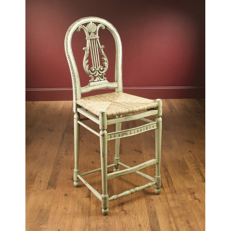 Bring in a classic touch to your dining areas with the Kirksey Bar Stool. Made from solid mahogany. It sports a lyre back design that was popular back in the 1800s but still fits contemporary settings. It makes use of a rush seat for that casual and relaxed feel. The stool is supported by wood-turned legs with accent stretchers. Bayou Breeze Color: Parchment
