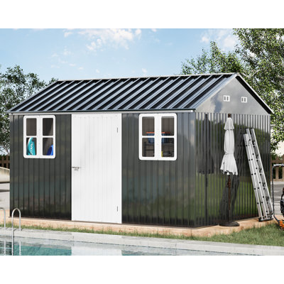 Introducing our 14' x 12' Shed Metal - a sturdy outdoor storage solution with lockable doors, ideal for your garden, patio, or backyard. With effortless installation and ample storage space of 168 Sq.Ft, it's perfect for storing tools, equipment, and outdoor essentials. Built with robust metal plates and a galvanized coating, it offers exceptional durability and protection against rust and moisture. Say goodbye to clutter and hello to organized outdoor spaces with our reliable shed. AECOJOY Siding Color: Dark GrayAECOJOY
