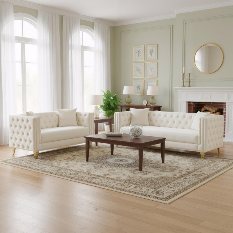 Achieve Designer Style Effortlessly: The 5-Seat Velvet Seating Group. Simplify your furniture buying process with this luxurious 2-Piece Chesterfield Set. It’s the definitive solution for creating a polished, cohesive, and deeply comfortable living room seating arrangement instantly. Delivers the ultimate blend of classic detail and Modern Glam sensibilities. The Button Tufting provides visual texture, while the continuous Gold Nailhead Trim ties the two pieces together, creating a harmonious look. The elegant Velvet is a neutral yet opulent choice that complements a wide variety of decor styles, from industrial to contemporary. Rosdorf Park Upholstery Color: Beige