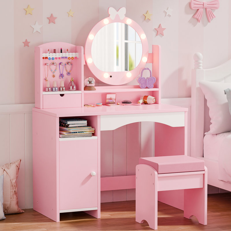 Let your little star shine with this enchanting Hollywood-style vanity set! Designed for aspiring fashionistas, this deluxe vanity features a premium lighted mirror with adjustable cool white and warm yellow lighting (requires 3 AA batteries, not included) - perfect for glamorous dress-up sessions and imaginative play. The thoughtful design includes specialized storage with 11 earring slots, 4 necklace hooks, and 4 lipstick holders to keep all precious accessories organized and within reach. Complete with a comfortable cushioned stool wrapped in easy-clean, anti-slip leather, the set offers both style and practicality. Ample storage solutions - including a tabletop drawer, lower cabinet, and open shelf - help maintain a tidy play space for makeup, toys, and treasures. Crafted from durable, child-safe materials that meet rigorous ASTM F963-17 and CPSIA standards, this princess-worthy vanity comes with clearly labeled parts and illustrated instructions for stress-free assembly. With its charming design and glowing lights, it makes the perfect gift to spark creativity and confidence in any little girl's special space. Aeloxis Color: Pink