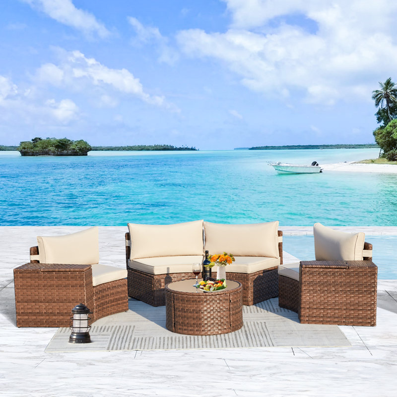 If you want to create a comfortable outdoor entertaining area in your yard, this furniture set could be a better selection for your family gathering. This outdoor patio half-moon set will provide comfort for both you and your guests. The modern and stylish design of the sofa set is perfect for any indoor or outdoor d-cor, even sunrooms or pools. The pe wicker sofa is made of exquisite hand-woven pe rattan, giving the look and feel of natural rattan with the durability and UV resistance of resin. The cushions are made of thick foam cushions and high-density foam that are soft and comfortable while still being waterproof. What are you waiting for, take it home and enjoy a pleasant outdoor time with your family and friends. The pe wicker sofa is made from exquisite handwoven pe rattan. Durable & sturdy tabletop for wine or delicious food. Removable & waterproof cushion cover with high-quality zippers. Exquisite ottomans with extra storage space to store fashionable magazines. 7-piece round patio sectional furniture sets can be combined freely according to your needs or different scenes. HOMHUM Cushion Color: BeigeHOMHUM