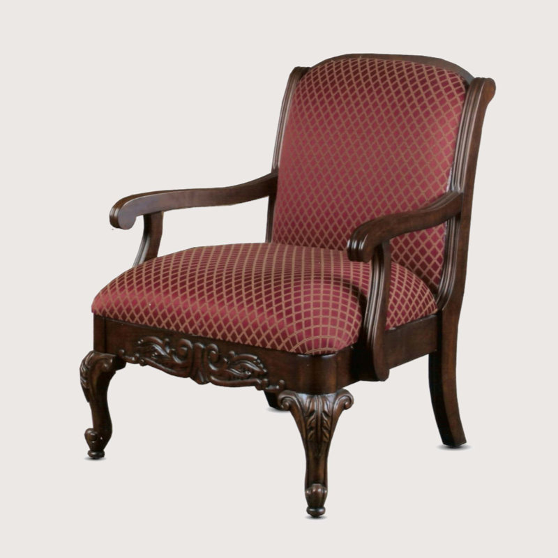 This beautifully crafted chair features ornately detailed hand carving and is complimented with a deep red jacquard diamond fabric. Crafted with solid hardwood construction this chair is sure to be a staple in your home for years to come. World MenagerieWorld Menagerie