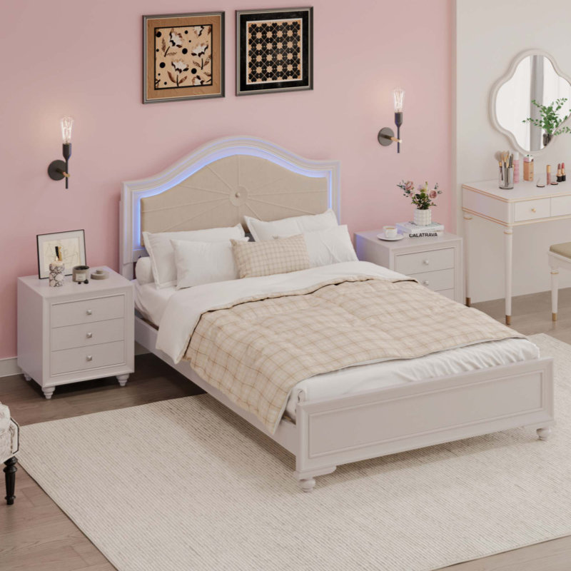 | 3 Pieces Bedroom Sets Wood Bed With Hidden LED Light Upholstered Headboard + 2 Nightstands | |
