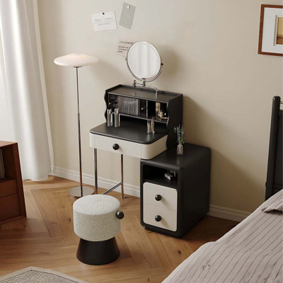 ?Functional Design?: This vanity desk features a thoughtful design with open storage shelves , The vanity desk Square mirror rotates 90 degrees horizontally to open, It have a hidden storage shelves area behind a round mirror, Its sleek design and elegant mirror make it an ideal addition to any bedroom Latitude RunLatitude Run