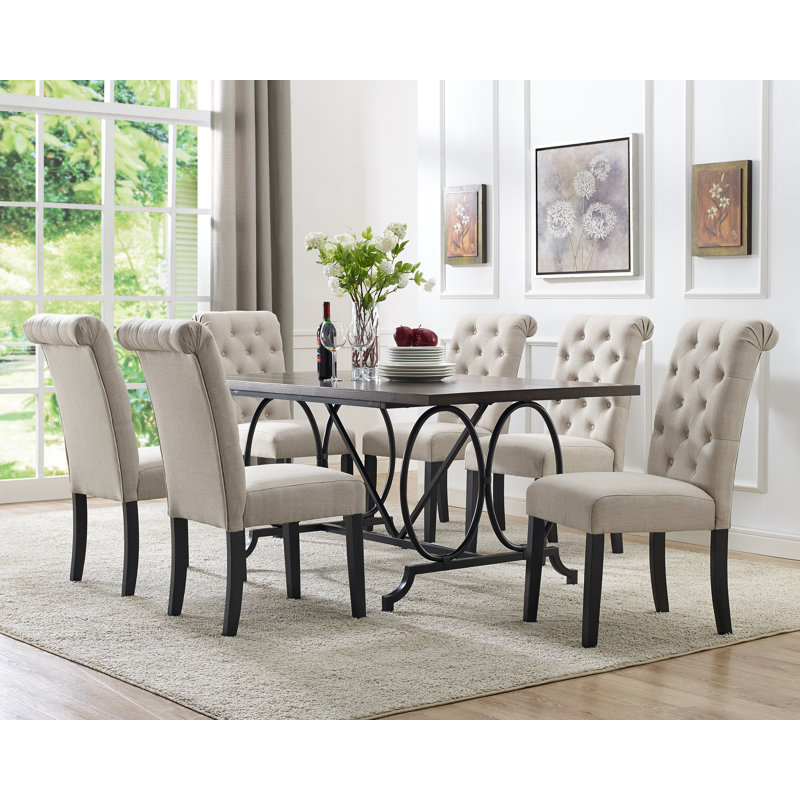 Elevate the look of your dining room with the comfortable sophistication of the Tinga dining series. This Niall 7 Piece Dining Set of six dining chairs and one dining table. Rubberwood construction and webbing seat structures ensure the durable and comfortable chairs stand up well to regular use, while the comfortably cushioned seats and backs are covered in 100% polyester fabric that is easy to clean. Classic tufted accents on the seatbacks complement the gently rolled tops, adding to the elegant look. Enjoy memorable meals with family and friends around the impressive table with its chic elm veneer top and sturdy steel base. Eye-catching circular details and a rich baking paint finish make this table a sophisticated standout in any home. Darby Home Co Chair Color: BeigeDarby Home Co