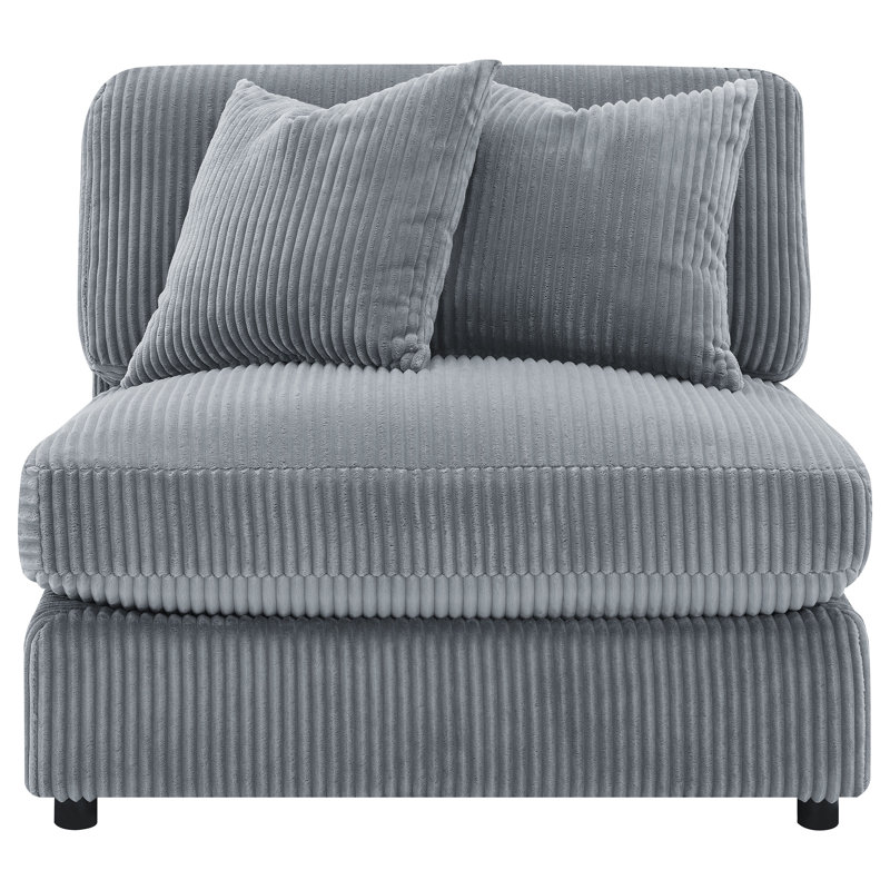 Instill cozy and inviting energy in your den or living room with a modern armless chair. Plush and comfortable, it features soft cushions and wide wale corduroy style upholstery in a soft neutral hue, perfect for augmenting existing seating. The seat and back cushions are each reversible, adding versatility and perfect for families and entertaining. Feet include non-skid grip to help keep the chair just where you place it within your space. Group couple by the fire, or add a cozy spot for reading and relaxing to your home office. Latitude Run Fabric: Gray PolyesterLatitude Run
