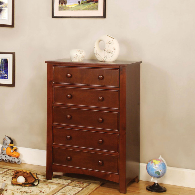 This lovely 5-drawer vertical chest reminds you of the time staying in a cabin on vacation, bringing the relaxed feeling. The plank-style top drawer front gives it a touch of a cottage feels in addition. Hokku Designs Color: CherryHokku Designs