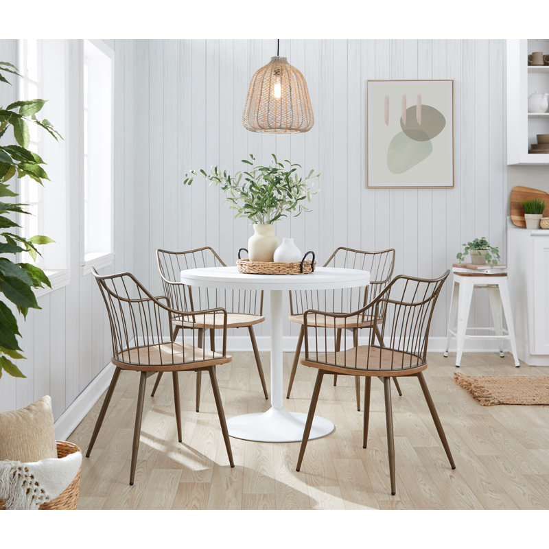 Contemporary styling White washed wood seats Antique copper metal backrest and armrests Wood table top Includes one table and four dining chairs Indoor use only George OliverGeorge Oliver
