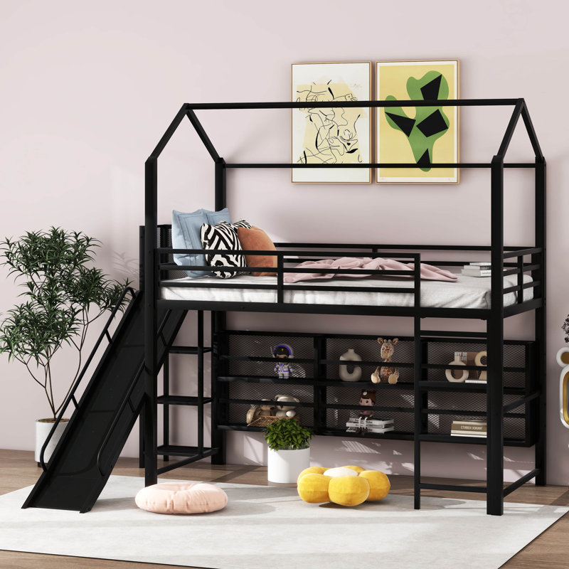 | Twin Size House Metal Loft Bed With Iron Mesh Shelves And Slide | |