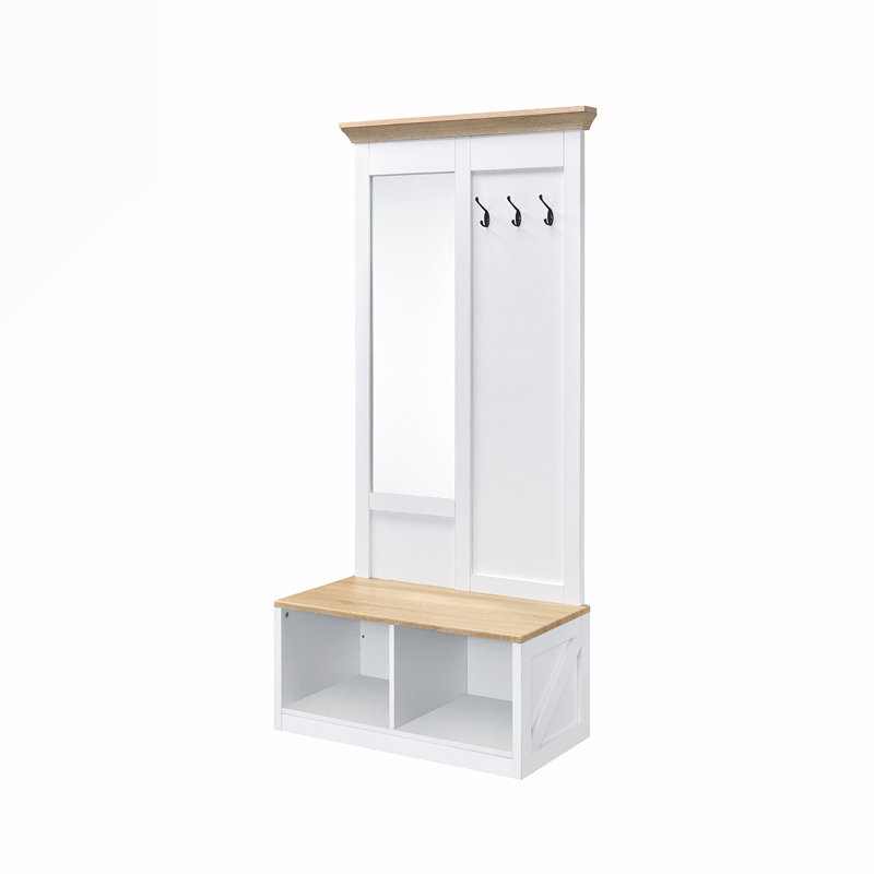 This Melati Hall Tree is a wonderful addition to your home. It combines style and functionality in a seamless way. The light oak and white finish gives it a charming look that can blend with various interior designs. The two open storage compartments and three metal hooks provide ample space for your belongings. The body length mirror allows you to check your appearance before leaving the house. The rectangular bench seat is not only comfortable but also offers additional storage for your shoes, helping you save space and keep your entryway organized. It's a perfect piece for those who value both aesthetics and practicality.The open storage compartments are spacious and can hold various items, keeping your entryway clutter-free.The three metal hooks are sturdy and convenient for hanging coats, bags, or scarves.The body length mirror is ideal for a final check before heading out, enhancing your daily routine.The rectangular bench seat is comfortable and provides a place to sit while putting on or taking off shoes.The combination of materials ensures durability and long-lasting use, making it a reliable choice. lonloo patilonloo pati