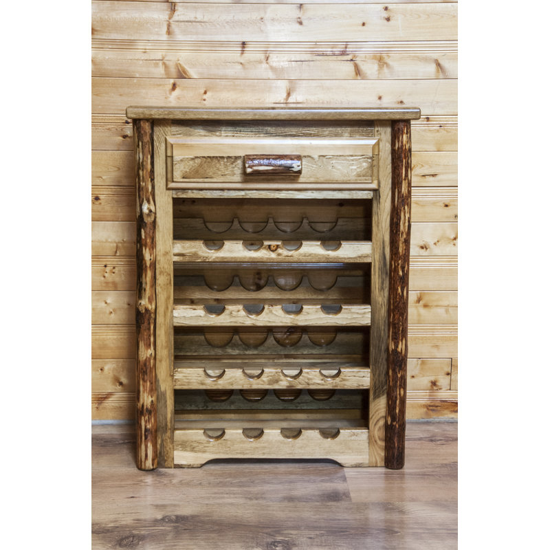 This wine bar features a truly unique finish reminiscent of the grand lodges of the Rockies, circa 1900. Craftsmen remove the outer bark using old-fashioned draw knives while leaving the inner cambium layer intact for increased texture and contrast. The process is completed in a professional eight-step process that applies stain and lacquer for a durable, low-maintenance finish. Dark, rich hues and tones provide an extraordinary appearance. Wine aficionados will delight in the wine cabinet with its 16-bottle capacity and matching accouterment drawer. Nicely trimmed with lodgepole pine accents, this sturdy wine cabinet will protect your investment in rustic style. Loon PeakLoon Peak