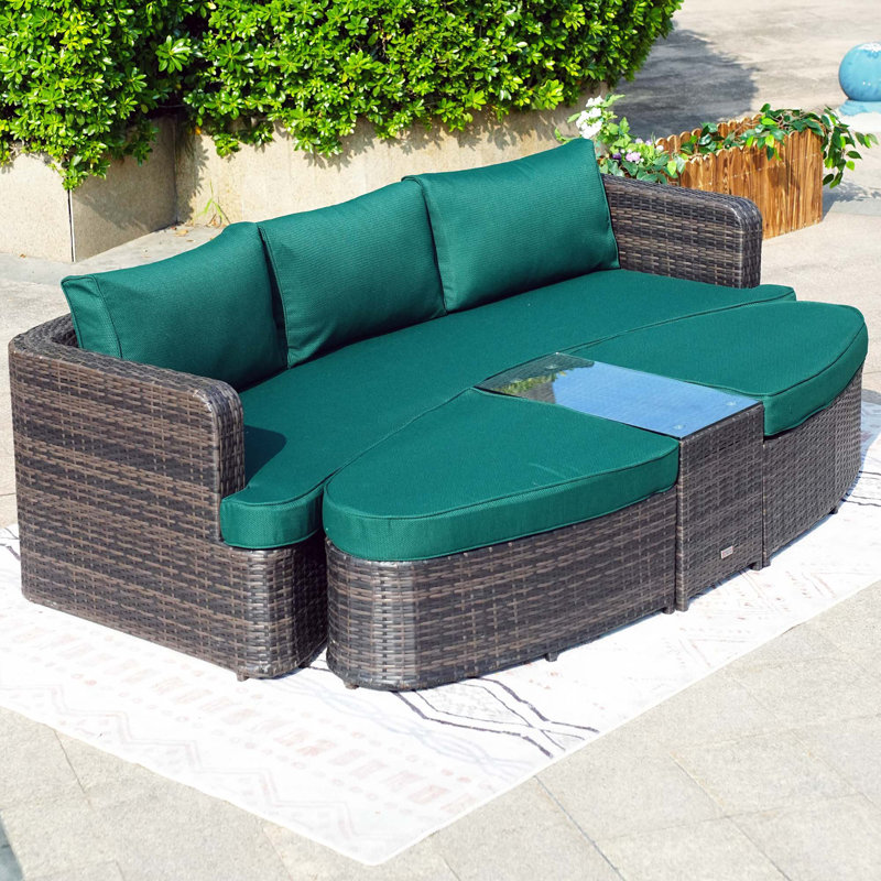 Crafted from the highest quality rattan, this lounge set exudes sophistication and durability. The included table features a toughened glass top, adding a touch of elegance and practicality. The chaise lounge's unique design integrates two-foot cushions, offering flexibility as footrests or extra seating for guests.Indulge in the ultimate comfort with the super thick, luxurious cushions that invite you to sit back and unwind. Whether you're lounging solo or entertaining friends, this stylish set is the perfect addition to any patio, garden, or poolside area. Primestok Cushion Color: Dark GreenPrimestok