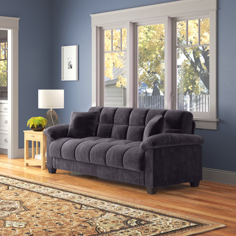 This convertible sleeper sofa provides plenty of padding as you relax in your living room, and it transforms into a bed when you have overnight guests. It has an engineered wood frame that rests on four tapered black legs. Wrapped in microfiber fabric, this sofa bed is filled with synthetic fiber for just the right amount of support. Pillowtop arms and biscuit tufting complete this more traditional design. Two toss pillows are also included, and the seat raises reveal a spacious storage compartment for blankets and other items. Lark Manorâ„¢ Upholstery Color: Ebony