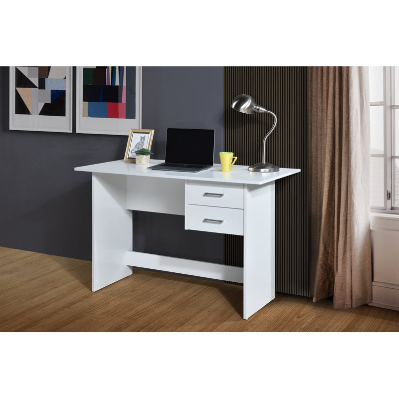 Anchor your home office in a contemporary style with this writing desk. Crafted of solid and manufactured wood in a black wood grain finish, this 30" H x 47" W x 24" D desk strikes a streamlined rectangular silhouette. The trestle base for this desk is founded on a leveler's feet, lending it a further sleek look. Set atop metal safety stop glides, two side drawers offer out-of-sight storage for all your office supplies and accessories, while the expansive desktop provides a perfect platform for your laptop and workspace essentials. Ebern Designs Color (Top): White