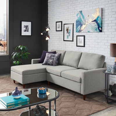 Create a warm and welcoming place to entertain with this 7-piece modular sectional. Plus, it is reversible, which allows you to configure it in the way that best suits your space. We love the traditional design elements, like the rolled arms and the nailhead trim, that give this sofa timeless, classic appeal. The frame is made from a blend of kiln-dried solid and engineered wood and has hand-tied spring construction designed for support and comfort. The removable back cushions are wrapped in foam and covered with easy-care polyester in a neutral hue. Six throw pillows and an ottoman complete this sectional. Three Posts Body Fabric: Light Gray Polyester BlendThree Posts