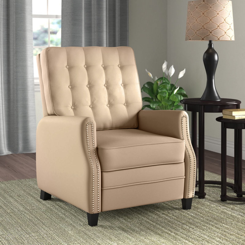 This tufted recliner features an updated take on a classic design that's sure to complement your French country decor. It showcases a clean-lined, solid wood frame on a black metal base that's wrapped in crisp polyester for a tactile feel. We love how its nailhead trim and deep button tufting add an elegant look to your living room or den. This chair is filled with foam and sinuous springs for lots of support during movie night or a fun get-together with family. Plus, its manual push-back reclining feature lets you kick back and relax in style. Winston Porter Fabric: Light BrownWinston Porter