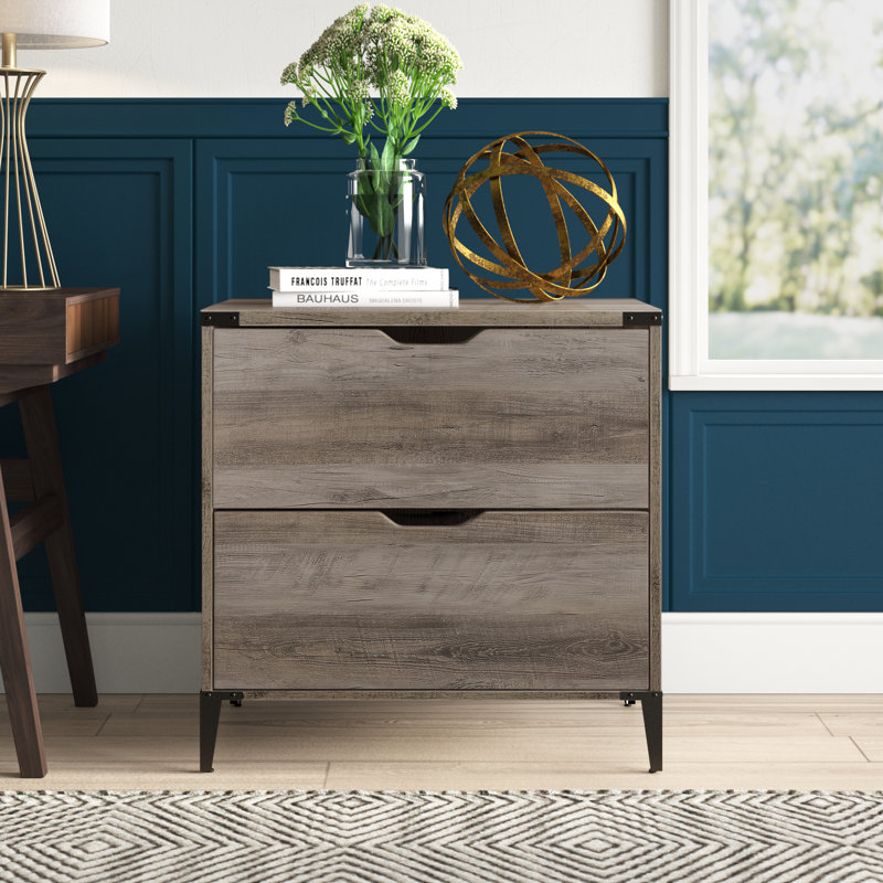 This 2-drawer lateral filing cabinet has a clean-lined silhouette and a rich, textured finish to give your home office a mid-century modern feel. It's made from engineered wood, and it rests on sleek black metal legs. Matching corner accents blend in nicely with the finished wood surfaces. Both drawers feature cutout handles and metal glides for easier opening and closing. They accommodate legal- and letter-sized files with hanging file bars included. With safety in mind, this cabinet also comes with anti-tilt guards. Wade Logan Color: Gray WashWade Logan