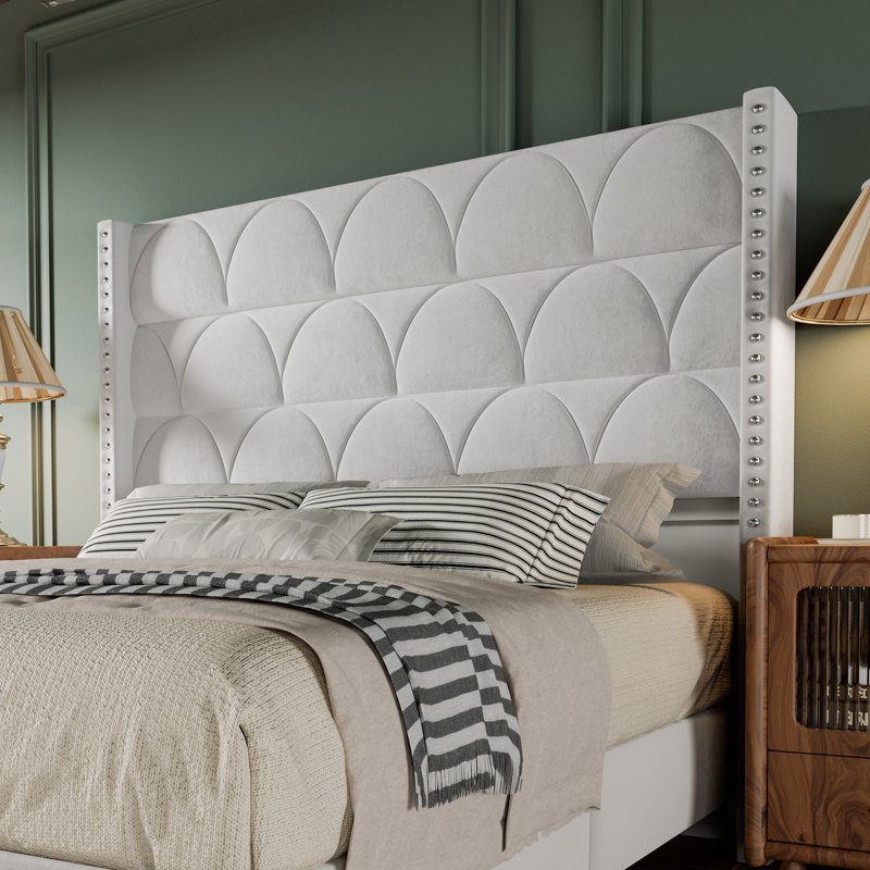 Refresh your bedroom with this 56.3-inch HIGH-BACK velvet upholstered headboard, designed to add warmth, texture, and refined character to your space. The floor-standing design creates a clean, finished look while easily accommodating different mattress heights and bed frame setups.Wrapped in soft, skin-friendly velvet and generously padded for comfort, the sculpted panel design adds depth and dimension, while the nailhead trim along the sides introduces a tailored decorative accent. The upholstery fabric is designed to resist everyday wear and has been abrasion-tested for over 30,000 rubs, helping maintain its appearance through regular use.Built with a reinforced internal structure combining engineered wood and a steel support system, this headboard balances elevated style with everyday durability. Designed for convenience, it includes all required hardware and can be assembled by one person in approximately 30 minutes—no professional installation needed. Available in Queen and King sizes, as well as White and Gray color options, it offers an effortless way to enhance both comfort and style in your bedroom. East Urban Home Color: Cream, Size: Queen